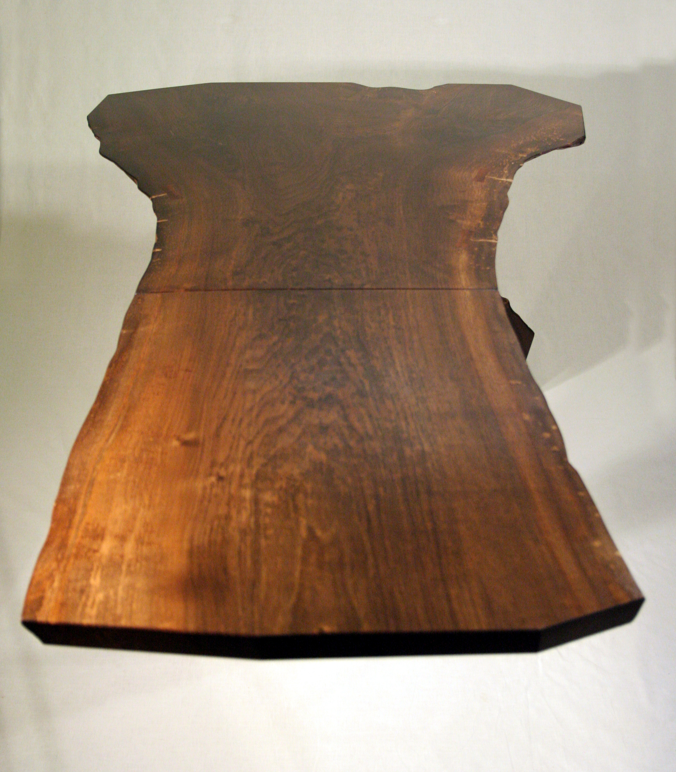 These natural edged slabs of walnut with beautiful crotch grain seemed to fit the bill to perfection when I was asked to make a kitchen table for a restricted space. When the leaf is down the table seats two to perfection, and when raised there is plenty of room for four.